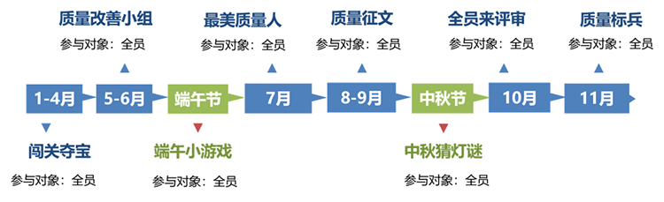 全质公司的咨询团队与北汽昌河质量部每年都策划制定相应的质量活动:全面质量管理知识竞赛、质量拍拍拍、最美昌河人、质量征文大赛、质量标兵等。全质认为,企业里的质量活动应该是持续的、波浪式的往前推动!